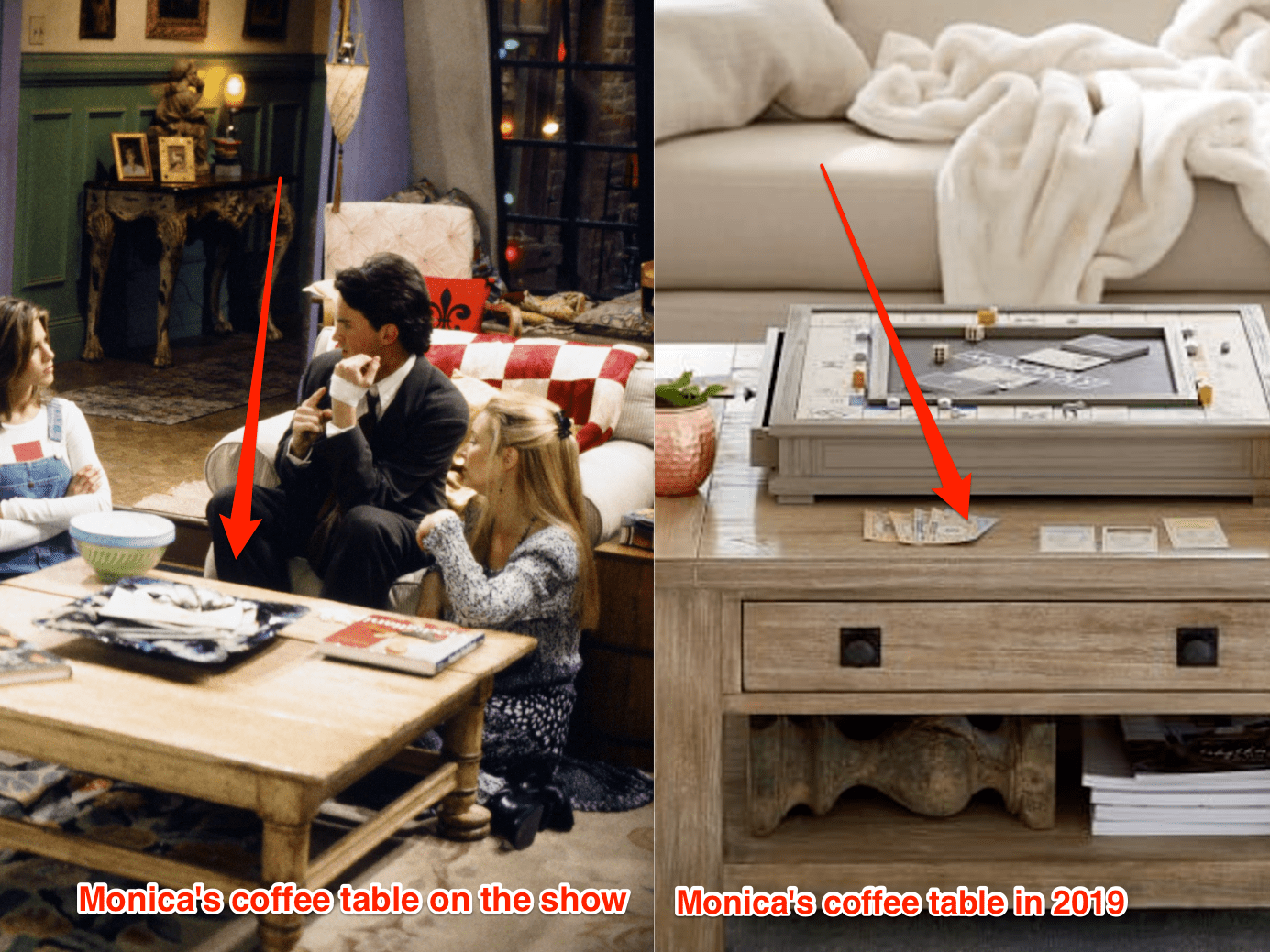 Living room may contain furnishings such as a sofa, chairs, occasional tables, coffee tables, bookshelves, electric lamps, rugs, or other furniture. | our latest set styling takes inspiration from the iconic living room of monica and rachel's apartment on friends. I'm just assuming here, but did your friend neatly cut the covers off, glue them to the table, and then put something like hodge podge.