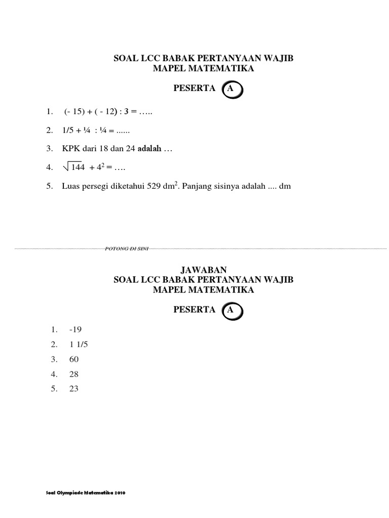 Download Kumpulan Soal Babak Penyisihan Lcc Sd. Savesave soal lcc matematika babak final for later. Download soal dan pembahasan mcshs babak penyisihan. Himpunan penyelesaian dari 6x y 2 = 0 dan 3x 2y + 5 = 0 adalah ? 39 parpol lokal aceh dan momor 41 sd 44 parpol nasional). Latihan soal lcc matematika sd disertai jawabannya. Kumpulan soal soal pai sd. Himpunan penyelesaian dari 6x y 2 = 0 dan 3x 2y + 5 = 0 adalah ?